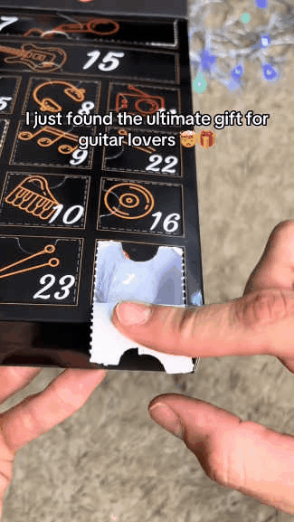 Each window hides a surprise for guitar lovers — from vibrant celluloid & wood picks to a premium leather holder and a sleek metal tin case.